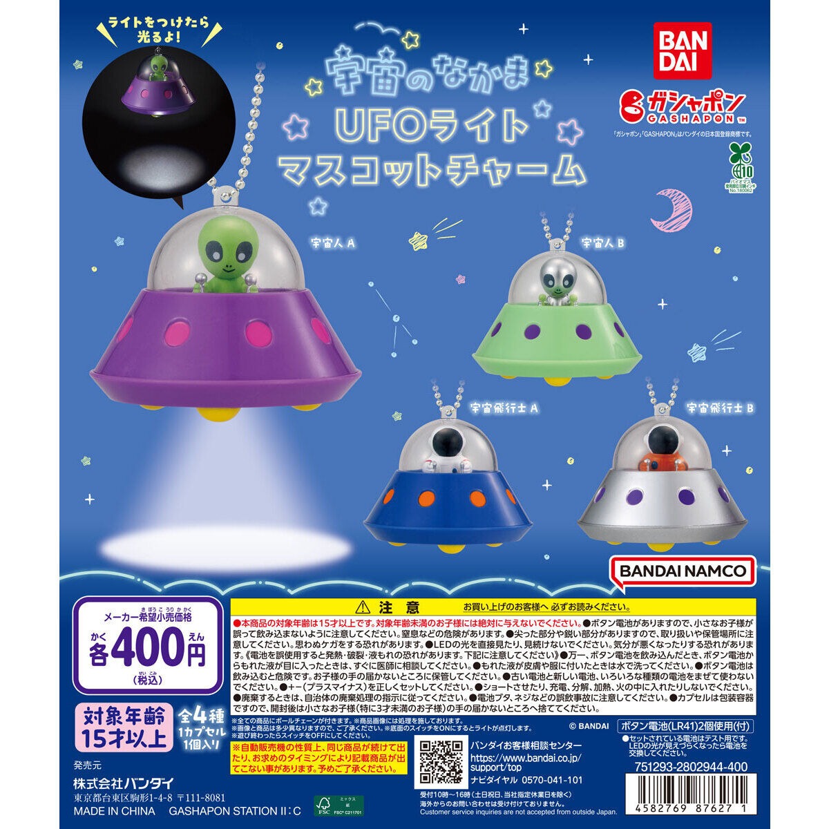 宇宙のなかま UFOライトマスコットチャームは、バンダイのガシャポンから出されています。