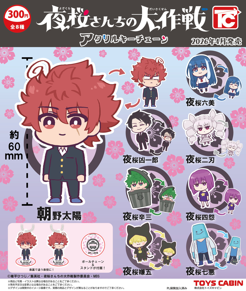 「夜桜さんちの大作戦 アクリルキーチェーン」のガチャガチャは『トイズキャビン』が出しています。