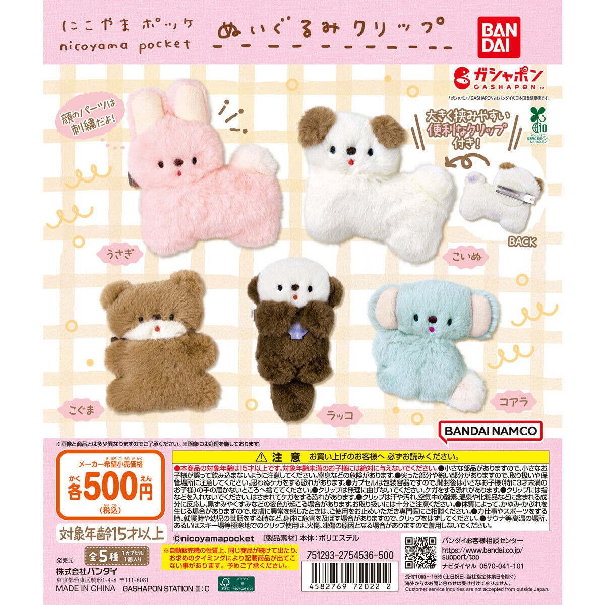 にこやまポッケ ぬいぐるみクリップのガチャガチャはバンダイが出しています。