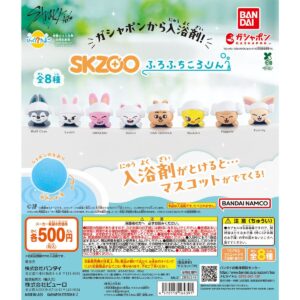 Stray Kids公式キャラクターのSKZOOが、びっくらたまごに初登場! 入浴剤を溶かすと、マスコットが1つ出てきます。 マスコットはお風呂のフチでならべて楽しめる「ふろふちころりん」シリーズ! サウナを楽しむSKZOOたちの頭の羊まきタオルと頬杖をついたポーズが可愛いマスコットです♪ 入浴剤を溶かすと水色のお湯となり、シャボンの香りが楽しめます。