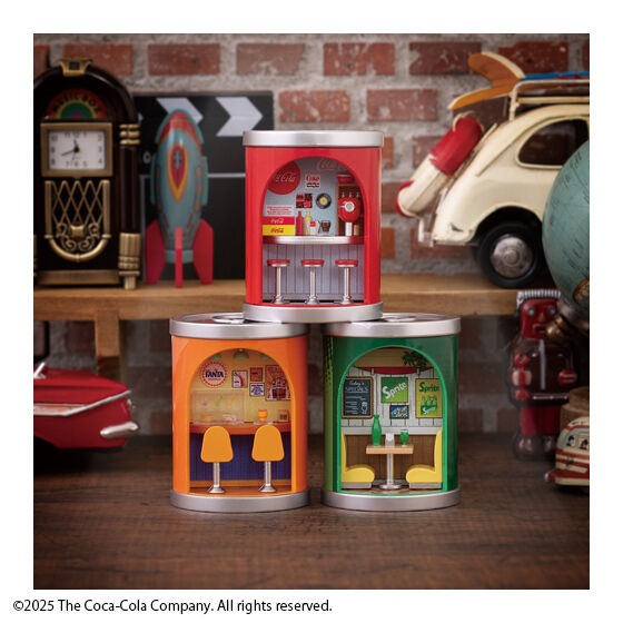 缶を回転させるとミニチュアのお店がオープン!コカ・コーラブランドのヴィンテージパッケージをイメージしたオリジナルデザインのコレクタブルフィギュアシリーズです。