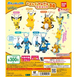 大人気シリーズ「つまんでつなげてマスコット」の14弾が登場!今弾はピチューの進化形、ピカチュウ、ライチュウとリオルの進化形、ルカリオをラインナップ!ボールチェーンVer.とカニカンVer.の2種展開で全10種です。たくさん集めてつなげよう!