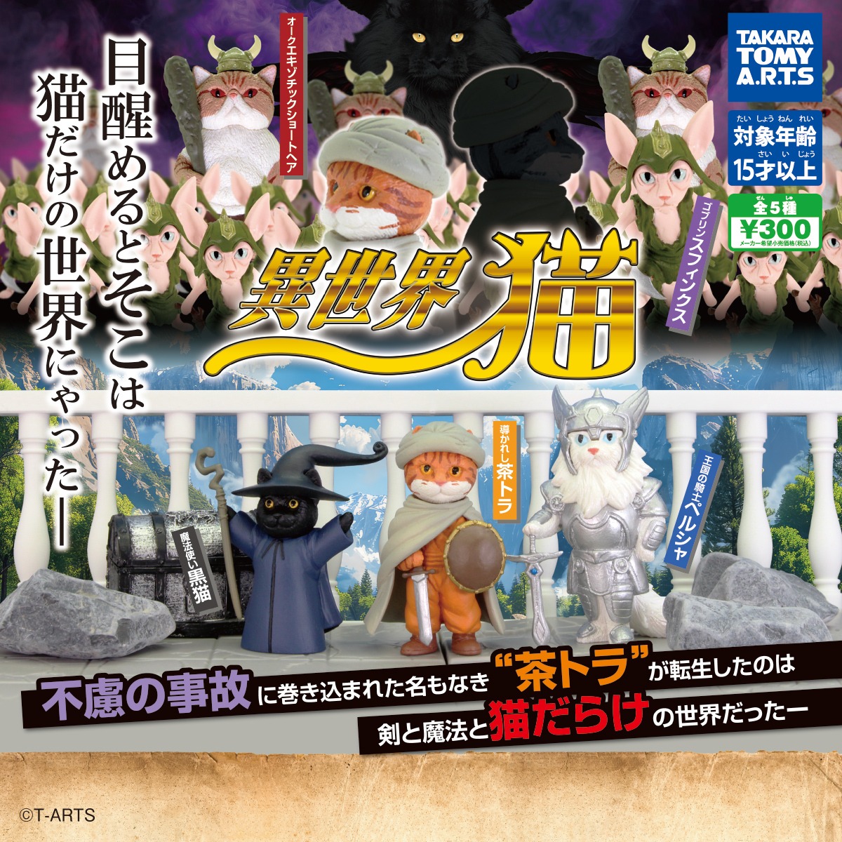 「異世界」×「猫」、という、2つの人気テーマがガチャで奇跡のコラボレーション! 「不慮の事故に巻き込まれた名もなき“茶トラ”が転生したのは、剣と魔法と猫だらけの世界だった」というテーマのもと、冒険の旅に出るパーティと敵たちが立体化されています。本体サイズは約5〜6.5cm。 ラインナップは 「導かれし茶トラ」 「王国の騎士ペルシャ」 「魔法使い黒猫」 「ゴブリンスフィンクス」 「オークエキゾチックショートヘア」の全5種。