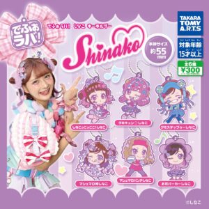 タカラトミーアーツオリジナルのデフォルメシリーズ「でふぉラバ!」のイラストを使用した、インフルエンサー「しなこ」のラバーキーホルダーです。ポージングや衣装は、ミュージックビデオや実際のSNS投稿からセレクトされています。本体サイズは高さ約5cm。 ラインナップは