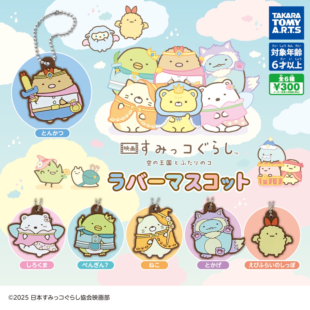 2025年10月31日公開の『映画 すみっコぐらし 空の王国とふたりのコ』に登場する、かわいい衣装を着たすみっコたちのラバーマスコット。ボールチェーン付きで、バッグや持ち物に付けて楽しむことができます。本体サイズは約4.5cm。