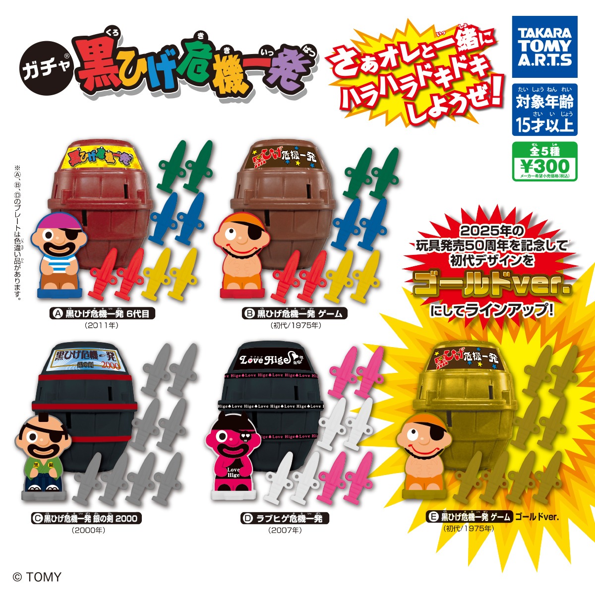 2025年に発売50周年を迎えた『黒ひげ危機一発』が、本物同様に遊べるミニサイズとなってガチャから登場。付属の剣を樽の穴にさしていき、人形プレートが飛び出せば勝ちです。本体サイズは約5cm。 ラインナップは 「黒ひげ危機一発 (6代目)」(2011年) 「黒ひげ危機一発ゲーム (初代)」(1975年) 「黒ひげ危機一発 銀の剣 2000」(2000年) 「ラブヒゲ危機一発」(2007年) 「黒ひげ危機一発ゲーム」(初代/1975年)ゴールドver.の全5種。