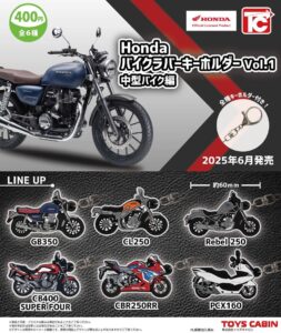「HondaバイクラバーキーホルダーVol.1中型車編」のガチャガチャは『トイズキャビン』が出しています。